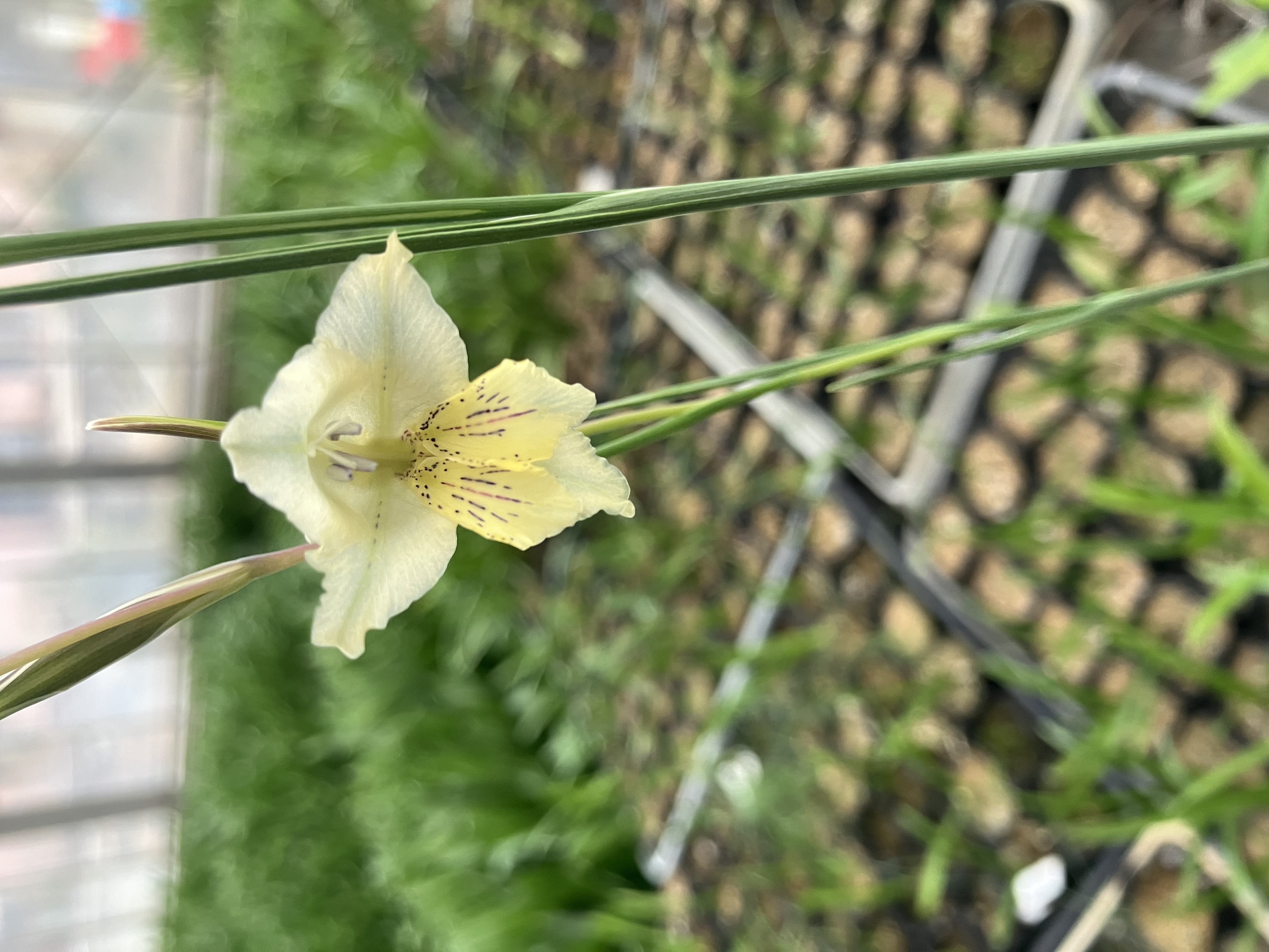 Gladiolus tristisの開花 2025 2/05 ブログ 2025年2月5日 南アフリカのカーステンボッシュ植物園から求めたグラジオラスの原種、Gladiolus tristisが開花する時節となりました。 今朝に当地は冷えて−3℃。咋夕の小雨の影響で道路はバリバリ。でも2月の太陽光は強くて8時過ぎには溶けていました。 グラジオラスはガラス温室の中で伸びやかに咲いています。 原種の花は清楚で良いですね。心が洗われる思いです。 当園ではこれからラケナリアの開花が始まり、しばらくはラケナリアシーズンが続きます。 ブログ